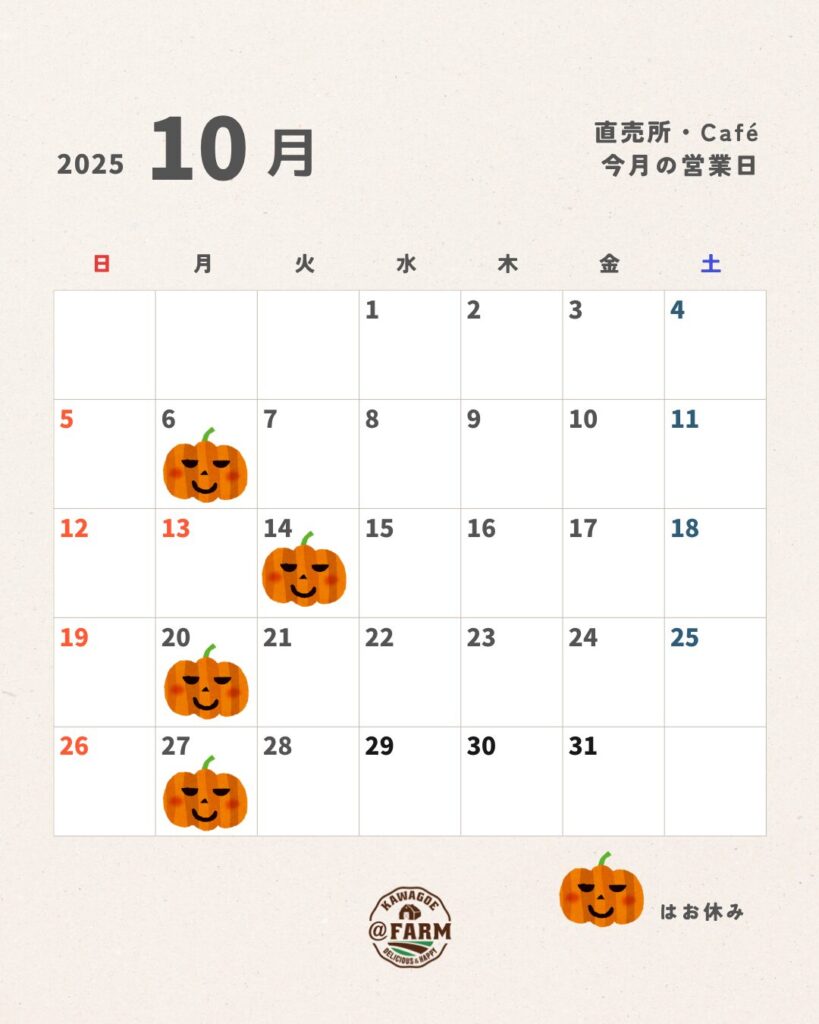 直売所・Caféの10月の休業日につきまして下記の通りとなります。