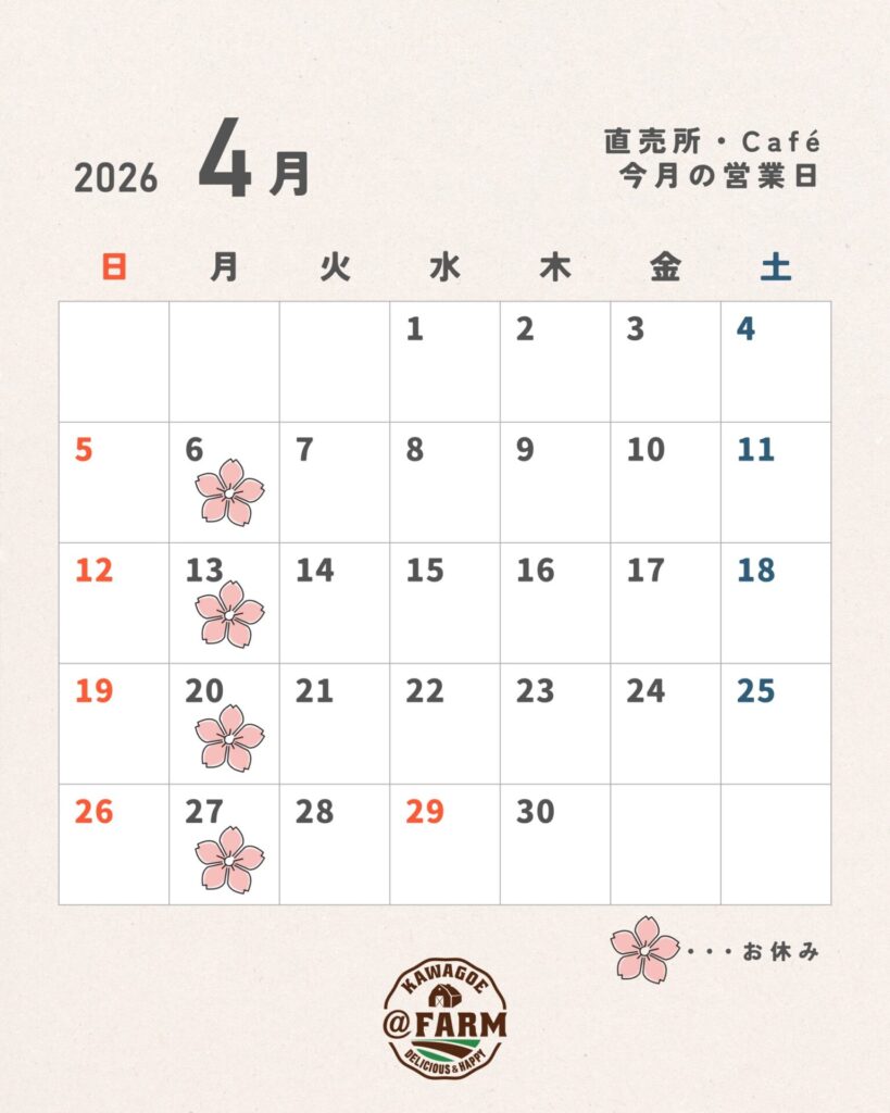 いつも@FARMをご利用いただき誠にありがとうございます!直売所・Caféの4月休業日についてお知らせいたします。
